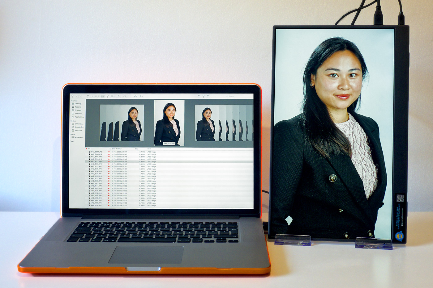 Now I can produce a first set of images, review them with the client on 2 screens, shoot more as required and tag their selected pictures for bespoke processing & background replacement through Lightroom, Aperture On1, Portrait Pro & Photoshop, which can be done on site if required.